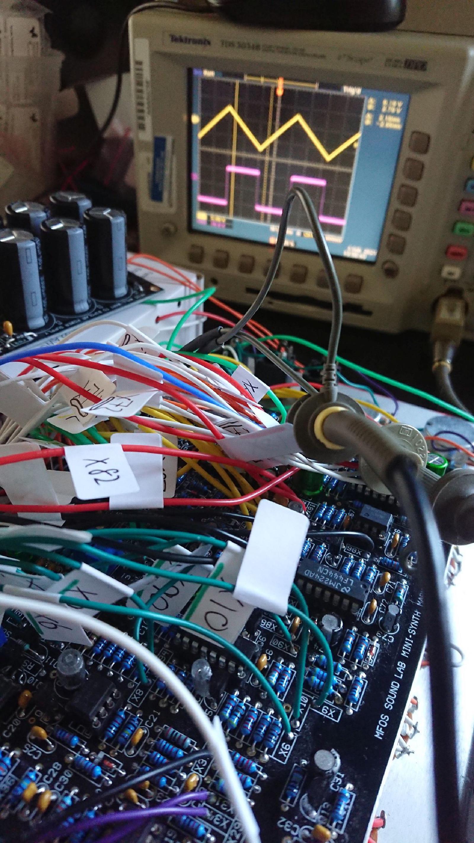 I tested the power supply yesterday and today connected it to the rest of the synthesizer. And wouldn’t you believe - things appear to be showing some signs of life! A couple of LEDs are not blinking - I would find it hilarious if I wired them up the wrong way - but VCO 1, the white noise generator, the, ADEG 1 and ADEG 2, and the LFO, are all putting out the correct waveforms. VCO 2 is doing something completely weird that is going to be “fun” to debug.