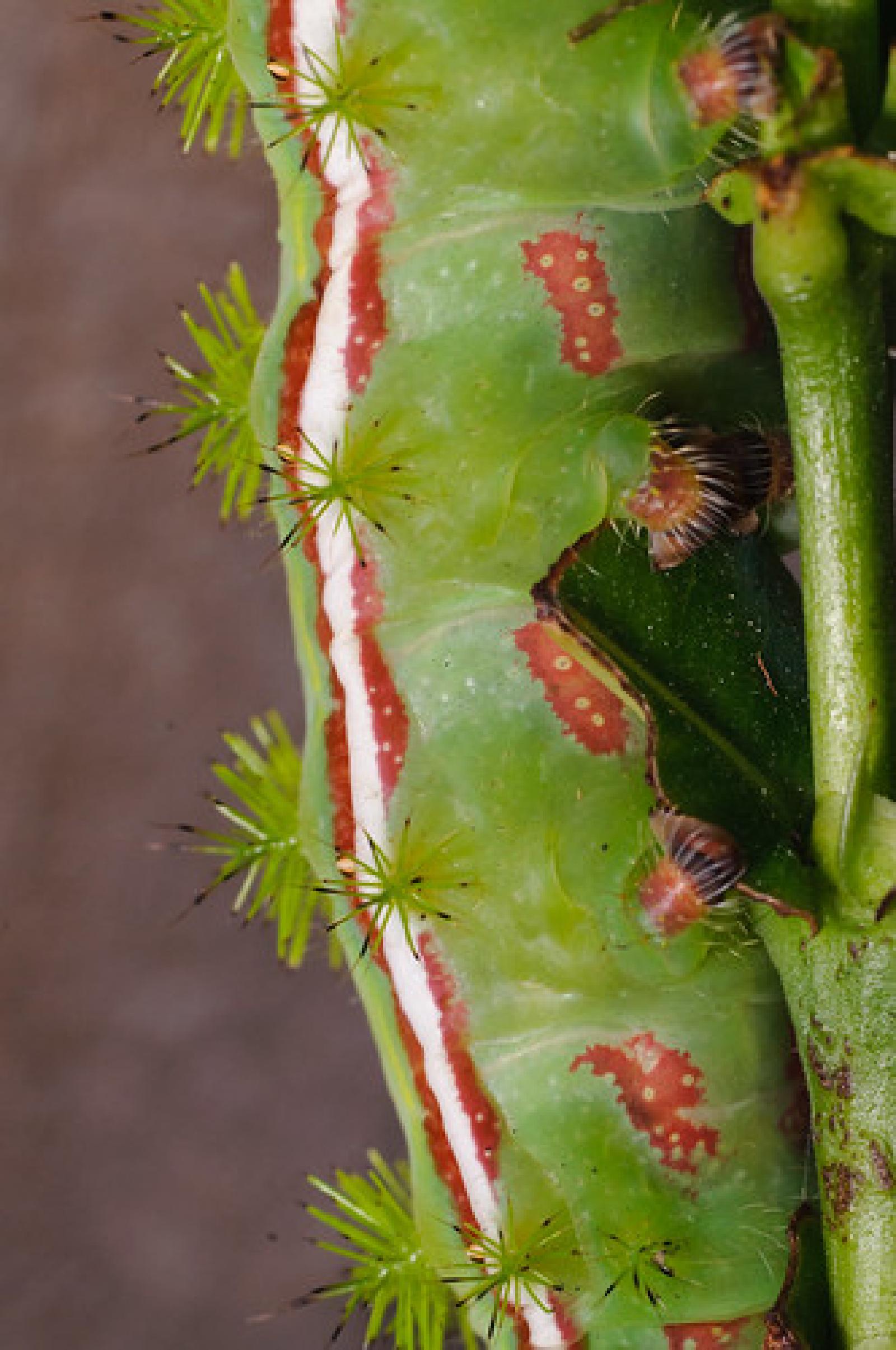 It’s the caterpillar of an Io moth. I was fascinated by the spines (which are actually poisonous, but not greatly) and the brown and white stripe running along the length of the caterpillar. Luckily it was early enough in the morning and wasn’t in a rush for work, so unpacked the monopod and macro lens and set to taking some shots. It ate most of the shrub, the least it could do was pose for me. DSC_4355.jpg