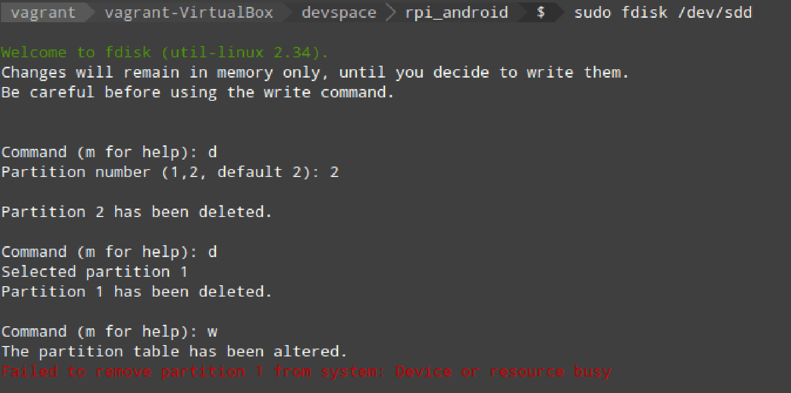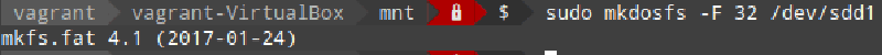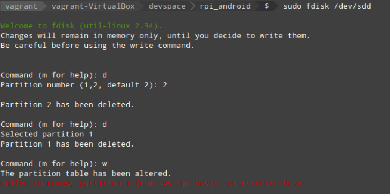 To set up the file systems correctly, I ejected/inserted the SDcard, and ran the following mkfs commands. The first makes /dev/sdd1 a vfat boot partition, and the second makes /dev/sdd4 an ext4 partition with label ‘userdata’.