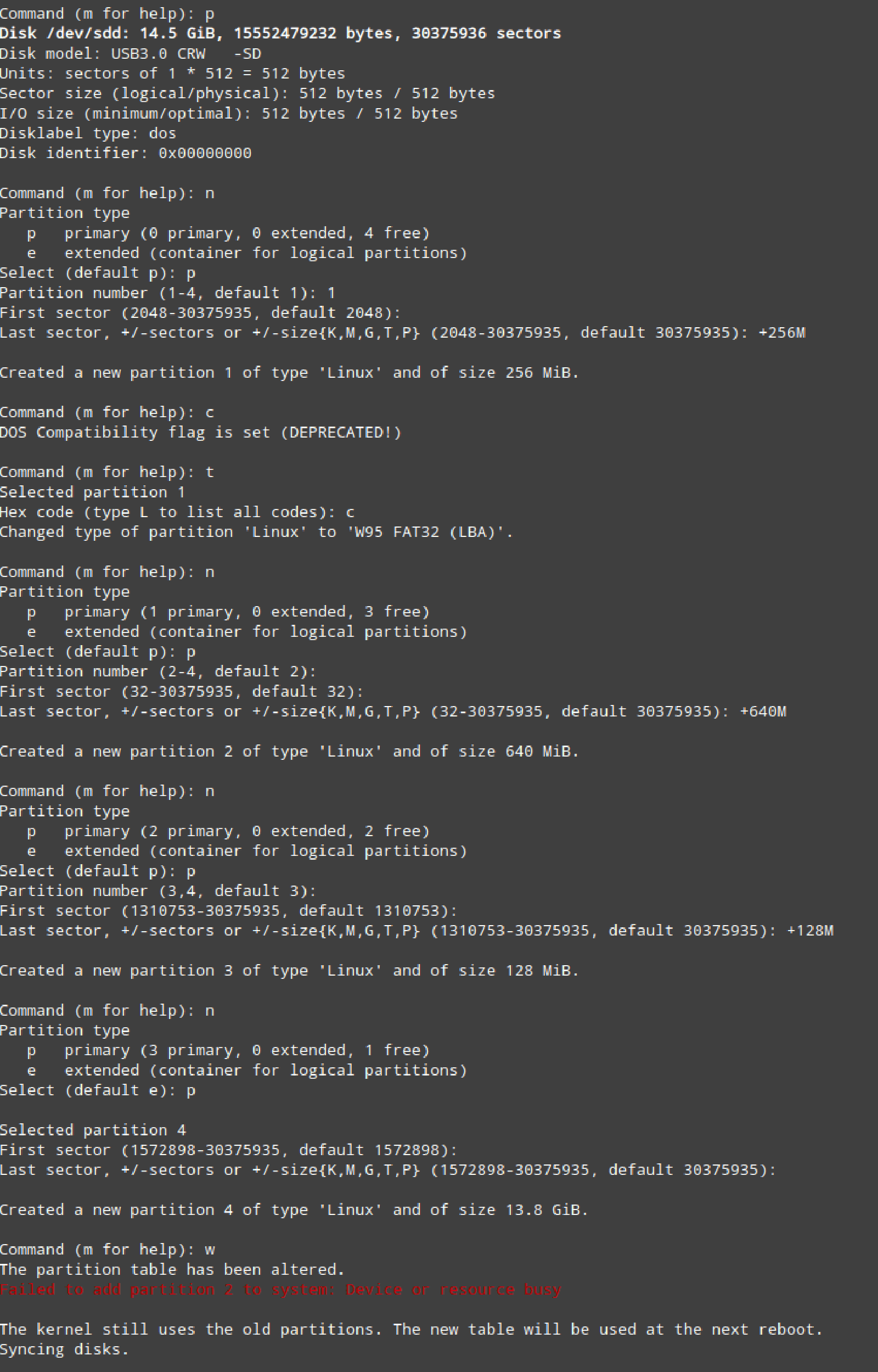 The fdisk command is again used to create the partitions: