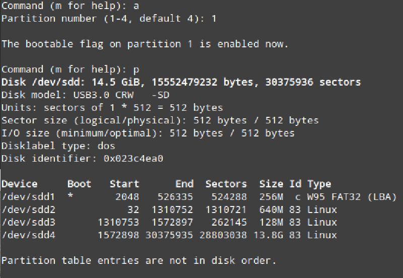 (Forgot to show making the /dev/sdd1 partition a boot partition)